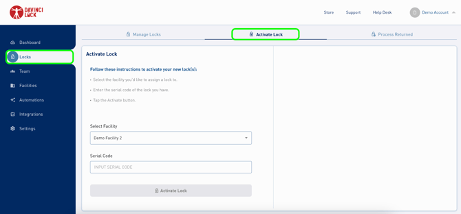- Click "Locks", navigate to the "Activate Lock" tab.