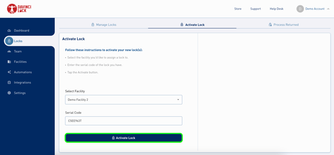 All locks need to be activated in a DaVinci Lock® account before they can be used. Locks can be activated on the mobile app or web portal. Activating on the mobile app supports the bulk activation of 10 locks at a time.