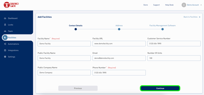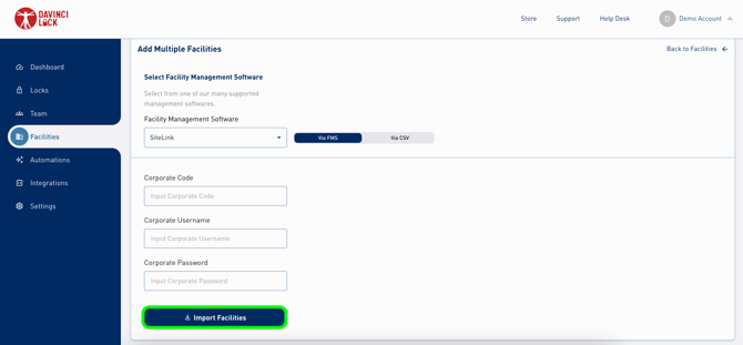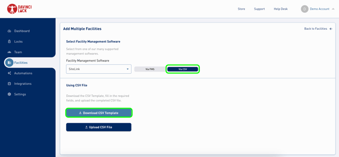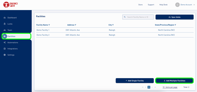Facilities can be added to your DaVinci Lock® account one at a time or in bulk.