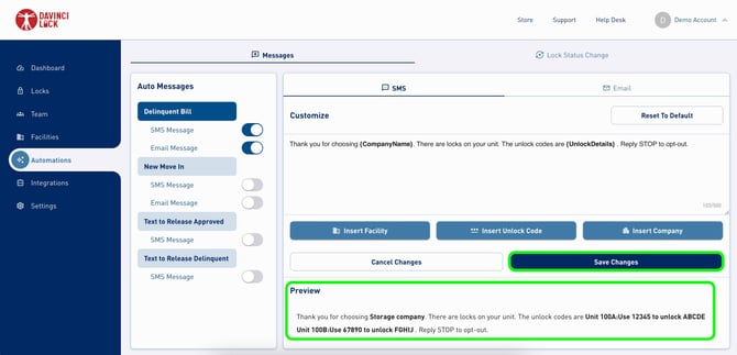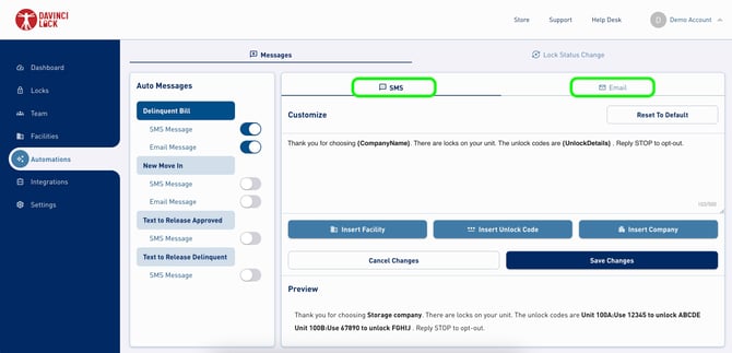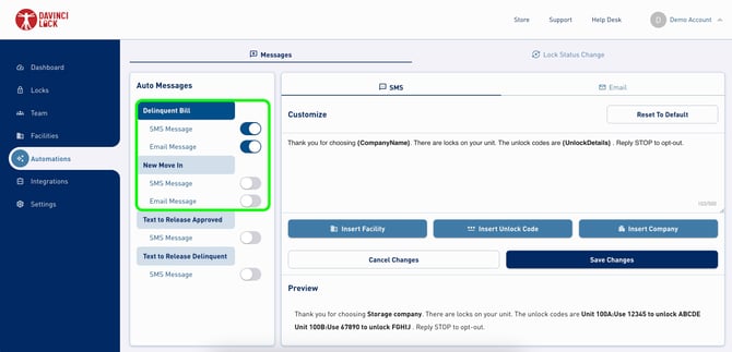 The DaVinci Lock® portal enables customization of two types of tenant notifications- notifications sent after payment for delinquent balance or new move-in, and Text-to-Release notifications. These notifications can be enabled/disabled by toggling "SMS Message" and "Email Message". Tenants can opt out of DaVinci Lock® notifications at any time by replying “STOP” to an SMS or modifying their preferences found at the close of the email. Tenants who opt out will not receive automated notifications with combination(s).